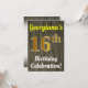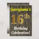 Este diseño de invitación para fiestas de cumpleaños incluye un mensaje como "¡La celebración de cumpleaños número 16 de Georgiana!", donde el nombre se puede personalizar, y donde el número "16" tiene una falsa apariencia de oro. También presenta un ambiente rústico de madera falsa. Los detalles del evento en la parte posterior se pueden personalizar. Se podría usar para invitar a la gente a la celebración de los dieciséis años de alguien o a la fiesta de cumpleaños. [~Z0000119]