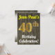 Este diseño de invitación para fiestas de cumpleaños incluye un mensaje como "¡La celebración de cumpleaños número 40 de Jean-Paul!", donde el nombre puede ser personalizado, y donde el número "40" tiene una falsa apariencia dorada. También presenta un estilo rústico de madera de imitación. Los detalles del evento en la parte posterior se pueden personalizar. Se podría usar para invitar a la gente a la celebración de 40 años o fiesta de cumpleaños de alguien. [~Z0000119]