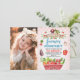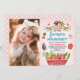 Campesinos de la planta rosada Foto del mercado Invitación de cumpleaños Invitación a las pequeñas granjeras dulces invitación al cumpleaños del mercado con un marco decorativo de arcos, carrito y varias verduras, bayas y mermelada en un fondo rosa pálido. Este diseño también incluye la foto de tu pequeña niña. Esta invitación es una encantadora manera de invitar y preparar el escenario para una fiesta de cumpleaños de los chicas en el mercado de los agricultores.