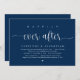 Tarjeta de invitación de boda íntima con tema de escritura en azul marino moderno (feliz para siempre). Es perfecta para su recepción de boda íntima / fiesta de celebración post-boda. Agregue sus detalles en fuente / letra negra coincidente.
