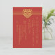 Líneas limpias modernas y contemporáneas con elementos tradicionales de bodas chinas, esta invitación de boda es ideal para parejas chinas que se casan. El carácter chino que significa doble felicidad, utilizado para la felicidad marital, se ajusta a una forma de corazón. El texto amarillo en falso dorado contrasta bien con el fondo rojo. ¡Personalice fácilmente con los detalles de su boda en texto chino!