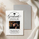 Elegante tarjeta de invitación de graduación y invitación a fiesta de graduación felicita y anuncia tu graduación con estilo! Cuenta con tapa de grado negra, "Graduado" en escritura y texto personalizado moderno que se puede personalizar con el nombre del graduado, la escuela y los detalles del fiesta. Añadir una foto favorita del gráfico. Tenga en cuenta que el color de acento gris neutro de la parte posterior de la tarjeta se puede cambiar a blanco u otro color que coordine con los colores de la foto o del fiesta.
