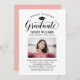 Elegante tarjeta de invitación de graduación y invitación a fiesta de graduación felicita y anuncia tu graduación con estilo! Cuenta con tapa de grado negra, "Graduado" en escritura y texto personalizado moderno que se puede personalizar con el nombre del graduado, la escuela y los detalles del fiesta. Añadir una foto favorita del gráfico. Nota: el color de acento subió de oro / rosa brillante en la parte posterior de la tarjeta puede cambiarse a blanco u otro color que coordine con los colores de la foto o del fiesta.