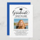 Elegante tarjeta de invitación de graduación y invitación a fiesta de graduación felicita y anuncia tu graduación con estilo! Cuenta con tapa de grado negra, "Graduado" en escritura y texto personalizado moderno que se puede personalizar con el nombre del graduado, la escuela y los detalles del fiesta. Añadir una foto favorita del gráfico. Nota: el color de acento azul/marino clásico de la parte posterior de la tarjeta puede cambiarse a blanco u otro color que coordine con los colores de la foto o del fiesta.
