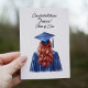 Esta tierna tarjeta de graduación muestra a una mujer de cabeza roja con vestido azul real. Personalice con el nombre del estudiante y la clase de información. El interior se deja en blanco intencionalmente para que puedas escribir un mensaje personal. ¡Elige los tuyos!