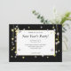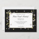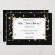 Invitación a la fiesta de Año Nuevo con mi diseño de brillantes estrellas y campanas de plata y oro sobre un fondo blanco y negro.