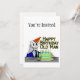 Un divertido diseño de cumpleaños con un esqueleto con gorra fiesta y telas de araña colgadas por todas partes, sentado frente a su pastel de cumpleaños. ¡Feliz cumpleaños, viejo!