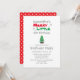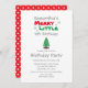 Los Navidades infantiles trataron alegres invitaciones de cumpleaños. Invitar presenta temas de vacaciones rojas y verdes con copos de nieve grises, árbol de Navidad y regalos