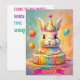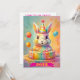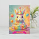 Un conejito juguetón se sienta orgulloso con un vibrante pastel de cumpleaños. El conejito está rodeado de suaves tonos pastel, decoraciones caprichosas y globos, creando una atmósfera alegre y festiva perfecta para un día especial.