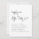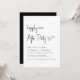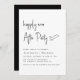 Invitación minimalista a la celebración de bodas en blanco y negro con "Feliz eterno después del Fiesta" en un guión moderno de moda, con sus detalles en letras simples y sus nombres en tipografía serif clásica.