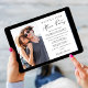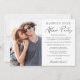 Salida de moda o pequeña invitación boda y recepción de boda o celebración de fiesta invitación. La parte frontal muestra su foto, "Feliz eterno después del Fiesta" en una mezcla de tipografía simple y un guión moderno, su invitación matrimonial personalizada y su invitación a la recepción, y sus nombres en un guión con estilo de firma. En el reverso aparece una foto adicional, sus nombres y fecha de boda.