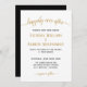 Invite a sus invitados a celebrar su día especial con esta moderna invitación a la boda de oro, blanco y negro. Añada su propio toque especial a este diseño simplemente elegante que incluye las palabras "felizmente siempre después", establecidas en la tipografía de escritura dorada que fluye, incluyendo texto curvo y glifos de cola larga junto con texto negro formal que contrasta. Siéntase libre de contactarme si necesita ayuda o un pedido del personalizado. Un fondo negro de coordinación está en la parte trasera.