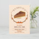 Invitación de Acción de Gracias con un pedazo sonriente de pastel de pecan listo para las vacaciones con una combinación de color marrón claro, marrón y naranja. Todo el texto es personalizable.