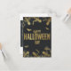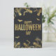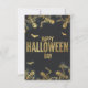 esqueletos bailarines espeluznantes diseño de tarjetas fiestas con texto dorado "Feliz Día de Halloween" fondo negro con el cráneo