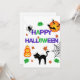 Esta invitación presenta las palabras "Feliz Halloween" en una fuente de impresión de estilo espeluznante con letras moradas y verdes rodeadas de una colección de calcomanías temáticas de Halloween en este tema y estilo espeluznante. Impreso en un papel clásico de 17,5 pt de grosor con un acabado mate sin revestimiento con una textura de cáscara de huevo fabricado e impreso en EE. UU. con "Truco o Trato" impreso en la parte posterior.