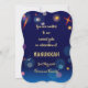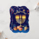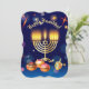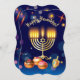 Invitación para la fiesta del Festival de las Luces de Janucá. Invitación de lujo o tarjeta de felicitación para el hermoso día festivo judío. Texto de Feliz Janucá (letra script) Fondo de luces Bokeh de Janucá con símbolos tradicionales de Chanucá: dreidels de madera (peonza), donas dulces, janukkiah menorá de oro, velas, estrella de David y patrón de color azul marino de luces brillantes, marco dorado. Decoración del Festival de Janucá. Jerusalén, Israel. Tarjetas de felicitación, invitaciones y anuncios de temporada y festivos.