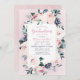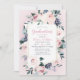 Marco geométrico rodeado de acuarela floral botánica y vegetación en suave color azul y marina, invitaciones modernas, femeninas y elegantes a la fiesta de graduación.