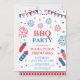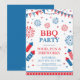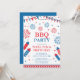 invitación de fiesta de barbacoa festiva del 4 de julio con marco de borde, banderas y fuegos artificiales aislado en fondo blanco. Diseño para invitaciones del Día de la Independencia de Estados Unidos. Tipografía personalizable en rojo y azul.
