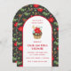 This invitation features red poinsettias and festive holiday greenery on a black background. All the party details can be customized.