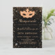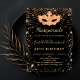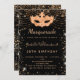 Para una elegante Mascarada, 50 años (o cualquier edad) de cumpleaños. Un elegante fondo negro. Decorado con un polvo falso purpurina dorado y una máscara de mascarada. Personalice y agregue un nombre, edad y detalles del fiesta. El nombre se escribe con un guión de estilo con letras a mano