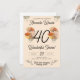 ¡Conmemora cuatro décadas de alegría con este impresionante diseño floral! Un audaz "40" está enmarcado por elegantes flores naranjas y rosadas con delicadas hojas en tonos pastel suaves, lo que hace que esta invitación sea ideal para una celebración de cumpleaños número 40. Agrega tu nombre y los detalles del evento para crear un recuerdo preciado. ¡Es una forma perfecta de reunir a seres queridos para un día de fiesta y reflexión!