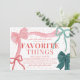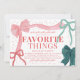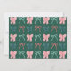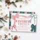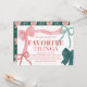 Celebre la temporada con estilo con esta encantadora decoración inspirada en el coqueta, las cosas favoritas de los Navidades invitan a las fiestas de vacaciones, con arcos pintados a mano, colores suaves y un diseño romántico y lleno de cintas. La parte frontal tiene cuatro arcos dibujados a mano: una cinta rosa audaz con rayas rojas, una cinta verde con rayas navales y dos acentos más pequeños en rojo y verde clásico. La parte trasera ofrece un alegre fondo verde con un delicado patrón de arco.