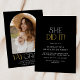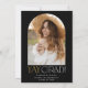 Esta moderna medalla de oro negro que ella hizo fue una invitación para graduarse con fotos es perfecta para una moderna fiesta de grado para ella. El diseño presenta una elegante tipografía boho con un toque sofisticado en el elegante oro negro y amarillo oscuro. Personaliza la invitación de tu fiesta de posgrado con una foto del año de postgrado, nombre, colegio y clase.