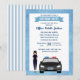 Invitación de fiesta de cumpleaños de oficial femenina con una oficial y un coche de policía. Agregue el nombre de su departamento en la placa del coche delantero. Muestre su aprecio a su policía favorita en su cumpleaños con esta invitación temática de policía.