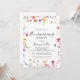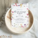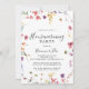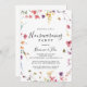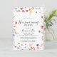 Esta clásica y colorida invitación a una fiesta de bienvenida en una casa floral salvaje es perfecta para una celebración rústica en una casa nueva. El diseño se compone de flores silvestres amarillas, violetas y blancas con follaje en un fondo de color rosa y verde.