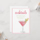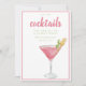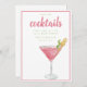Esta invitación de fiesta de cóctel Cosmopolitan chic es la elección definitiva para un evento elegante y moderno. El diseño elegante presenta un vaso de cosmopolitan con el icónico tono rosa del cóctel, lo que lo convierte en la elección perfecta para una fiesta sofisticada y trendy. Asegúrese de incluir todos los detalles necesarios, como la fecha, hora y ubicación de su evento, para que sus invitados puedan marcar sus calendarios. ¡Su invitación seguramente impresionará y emocionará a sus invitados para una noche de glamour y diversión!