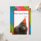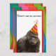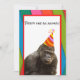 La divertida invitación a la fiesta de cumpleaños de animales fiestas incluye una foto de un gorila. El gorila tiene un gorra fiesta en la cabeza con rayas naranjas, amarillas y violetas. El gorila animal fiesta está sobre un fondo blanco con guarnecido rojo. El fondo general del diseño es azul, verde, rosa y cinta naranja como si se tratara de bandas superpuestas. Hay un texto de personalizable con una divertida letra negra que dice "¡Fiesta como un animal!" El reverso de la invitación tiene el mismo fondo de diseño de cinta superpuesto y área blanca sólida con guarnecido rojo. En el área blanca está el texto de personalizable en negro donde puedes agregar todos los detalles de tu fiesta de cumpleaños. La invitación perfecta para la fiesta de cumpleaños del gorila y el amante de los primates!