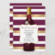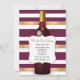 Invitación a una fiesta con tema de vino realizada en un patrón de rayas granate, blanco y dorado, con gráficos de una gran botella de vino tinto. Un área de texto decorativa tiene texto personalizable listo para personalizar para su evento.