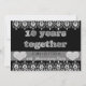 Crea tus propias invitaciones personalizadas y elegantes para el décimo aniversario en negro. En la parte delantera hay texto en 3D que parece metal gris cepillado, hojalata o aluminio. Se lee '10 años juntos'. Sobre una tira translúcida en negro, con letras sombreadas se lee 'Estás invitado a una fiesta de aniversario'. Corazones de gemas de diamantes falsos adornan cada extremo. La parte superior e inferior están bordeadas con un borde de encaje de diamantes. La parte trasera tiene letras negras con aspecto 3D para la información personalizada de tu fiesta de aniversario de bodas número 10 moderna. Personaliza como quieras. Visita nuestra tienda Zazzle.com/angela65 para más suministros para la fiesta del décimo aniversario.