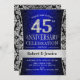 Invitación a la fiesta sorpresa de aniversario de bodas 45 en azul zafiro, negro y plata.