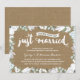 Esta elegante y moderna invitación de aniversario de bodas de 70 años presenta una encantadora caligrafía de pincel, hermosas flores azules y blancas, tipografía que dice "Acaban de casarse (¡hace setenta años!)", y un fondo de papel kraft impreso.