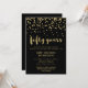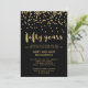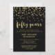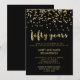 Estas invitaciones festivas y elegantes son perfectas para una fiesta de aniversario de bodas de 50 años. Confeti dorado falso y tipografía moderna sobre un fondo negro oscuro. Perfecto para una celebración de aniversario dorado.