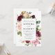 El diseño presenta un elegante ramo de acuarela o corona en tonos de rojo borgoña, Marsala, rosa suave, melocotón y más sobre elementos de vegetación de eucalipto y hojas doradas vintage.