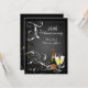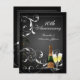 Invitación elegante y personalizada para el aniversario de 10 años o cualquier año. Las invitaciones hermosas y festivas presentan un diseño en blanco y negro con un patrón elegante y giratorio y dos copas de champán burbujeante con una botella de champán teñida de verde para celebrar el gran día de los invitados de honor. Fondo negro y plateado con remolinos en blanco y negro