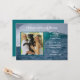 Invitación a la fiesta del aniversario con foto de la pareja. Diseño de ondas oceánicas estrelladas con fuente blanca de estilo inglés antiguo - cambia en el área personalizar. Una audaz línea de texto en la parte superior para años de matrimonio. Toda la información del fiesta se agrega utilizando una plantilla de párrafo. Subir una foto, horizontal o vertical, con el tema en el centro. La plantilla de la foto cuadrada está delineada en blanco. Revertir es color verde-azul sólido.