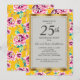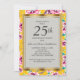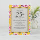 Flores rosadas brillantes y amarillas con hojas verdes en una hermosa invitación de aniversario de bodas número 25 de color mostaza amarillo con borde dorado. El texto, la fuente, el tamaño de la fuente y el color son completamente personalizables, por lo que esta tarjeta se puede personalizar para adaptarse perfectamente a sus necesidades.
