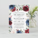 La plantilla presenta una elegante corona de flores de acuarela en tonos de rojo burgundy, Marsala, azul marino y rosa rubor con una tipografía moderna.