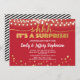Elegante invitación de fiesta sorpresa dorada con diseño de luces de cuerda en fondo rojo. Diseño clásico.