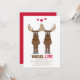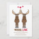 Alce caprichoso lindo que dice "debe ser amor". Este diseño presenta invitaciones divertidas, caprichosas y divertidas para aniversario, perfectas para fiestas de aniversario de bodas, una celebración de reunión, un corazón de animal de alce de humor, una cita de "debe ser amor", una fuente tipográfica fresca y única, estilo moderno y elegante, pareja marido y mujer, ilustración gráfica de dibujos animados rojos con corazones, invitación divertida y linda para aniversario.