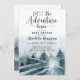 Invitación de baby shower de árboles del bosque en acuarela con la frase: que comience la aventura tema. Colores suaves etéreos azul gris. Nombre en firma de letra script. Bosque de acuarela azul verde.