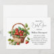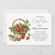 Invitación de baby shower con una ilustración adorable que presenta fresas frescas recogidas que llenan una cesta de mimbre encantadora.