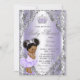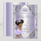 Invitación a baby shower púrpura y plateado con adorable bebé africana con cabello afro esponjoso y lindo wearing un precioso tutú lavanda púrpura y corona plateada sobre un fondo lavanda y plateado. Esta linda invitación de baby shower púrpura y plateado se personaliza fácilmente para su evento simplemente agregando los detalles de su evento.