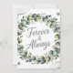 Una delicada tarjeta de bienvenida boda con una hermosa y detallada cortina de eucalipto a color de agua en tonos verde menta y verde salvia, que rodea un sutil fondo blanco texturado. En la corona se entremezclan sorbos de aliento del bebé y pequeños acentos de perlas, creando un ambiente elegante y un poco rústico, con un suave resplandor que realza el efecto acuarela. A lo largo del centro de la corona, el texto "FOREVER & ALWAYS" se muestra en una letra de escritura moderna y fluida en un suave gris plateado, complementando los tonos naturales y evocando un sentido de romance eterno. El interior de la tarjeta ofrece un amplio espacio para un mensaje sincero e incorpora un ilustracion de espiral de eucalipto simplificado en la esquina inferior, manteniendo la serenidad y el tono emocional celebratorio.