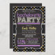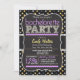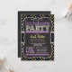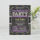 Invitación de la fiesta de la Bachelorette con estilo de pizarra retro sobre el patrón de estrellas negras, grises oscuras y amarillas con elementos de diseño de ric púrpura y fuentes de apariencia de tiza.
