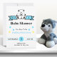 Invitación de baby shower para niño con oso de peluche y estandarte sobre fondo blanco. La tarjeta es completamente personalizable, puedes editar el texto y los colores tanto del texto como del diseño, incluso el color de fondo se puede personalizar. Cuenta con letras sencillas y contemporáneas y acentos circulares para una reunión divertida y casual que celebra ese momento especial que está por llegar. Si necesitas ayuda para personalizar esta tarjeta, contacta con la diseñadora en ArtByLiz@gmx.com y se personalizará para ti sin cargo adicional.