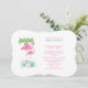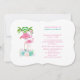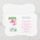 Una invitación de fiesta de bebé con una ilustración de una pareja de flamencos rosas (mamá y bebé) parados sobre un ramo de flores de colores pastel. Palmeras verdes se mecen en la parte de atrás. Tropical y bonito.
